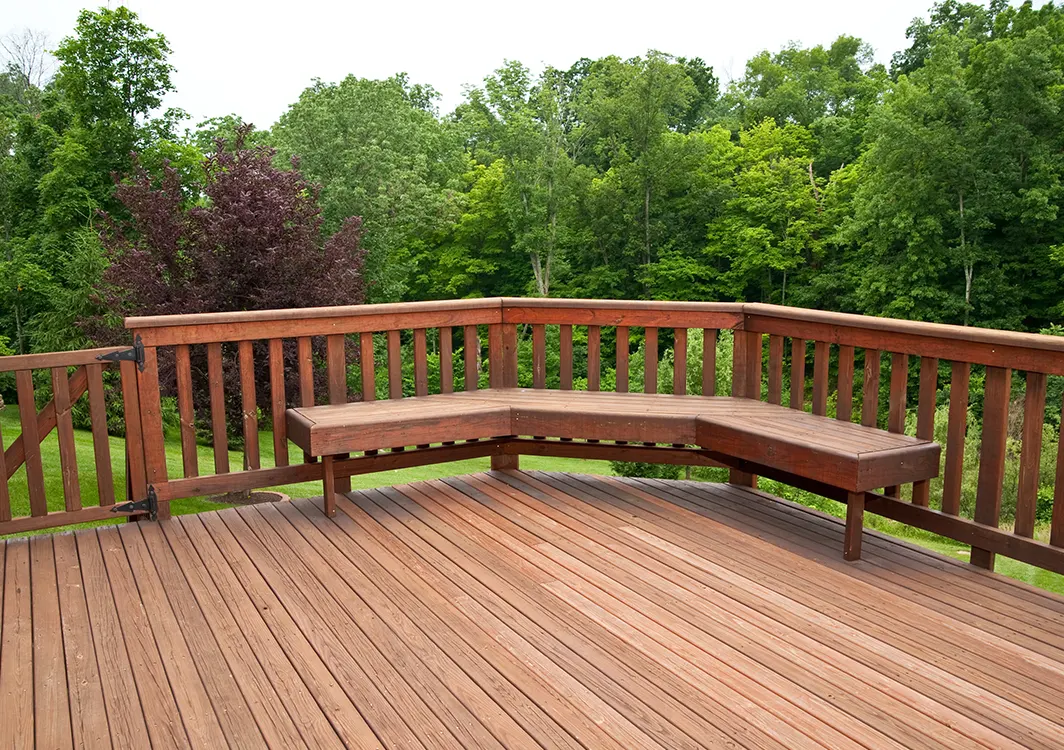 100 sq. ft. wood deck featuring premium materials. This package covers comprehensive planning, obtaining necessary permits, acquiring high-quality materials and equipment, meticulous area preparation and protection, professional installation, superior finishes, and complete cleanup.
